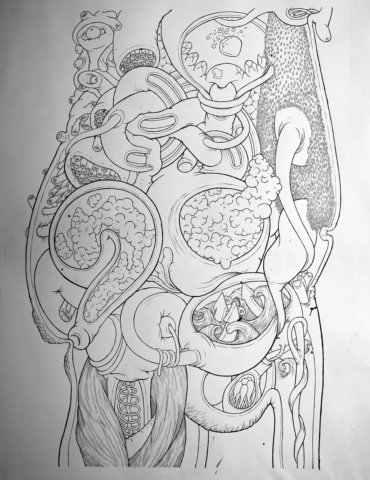 The color is the study (12"x18") for the ink below (62"x52). Lots of changes - can you spot them all? I'll start you off with a fun one: the nipple is livelier on the new ink drawing than on the color study. See how easy this game is? Find some more! Click here for more in this Future Trash series.