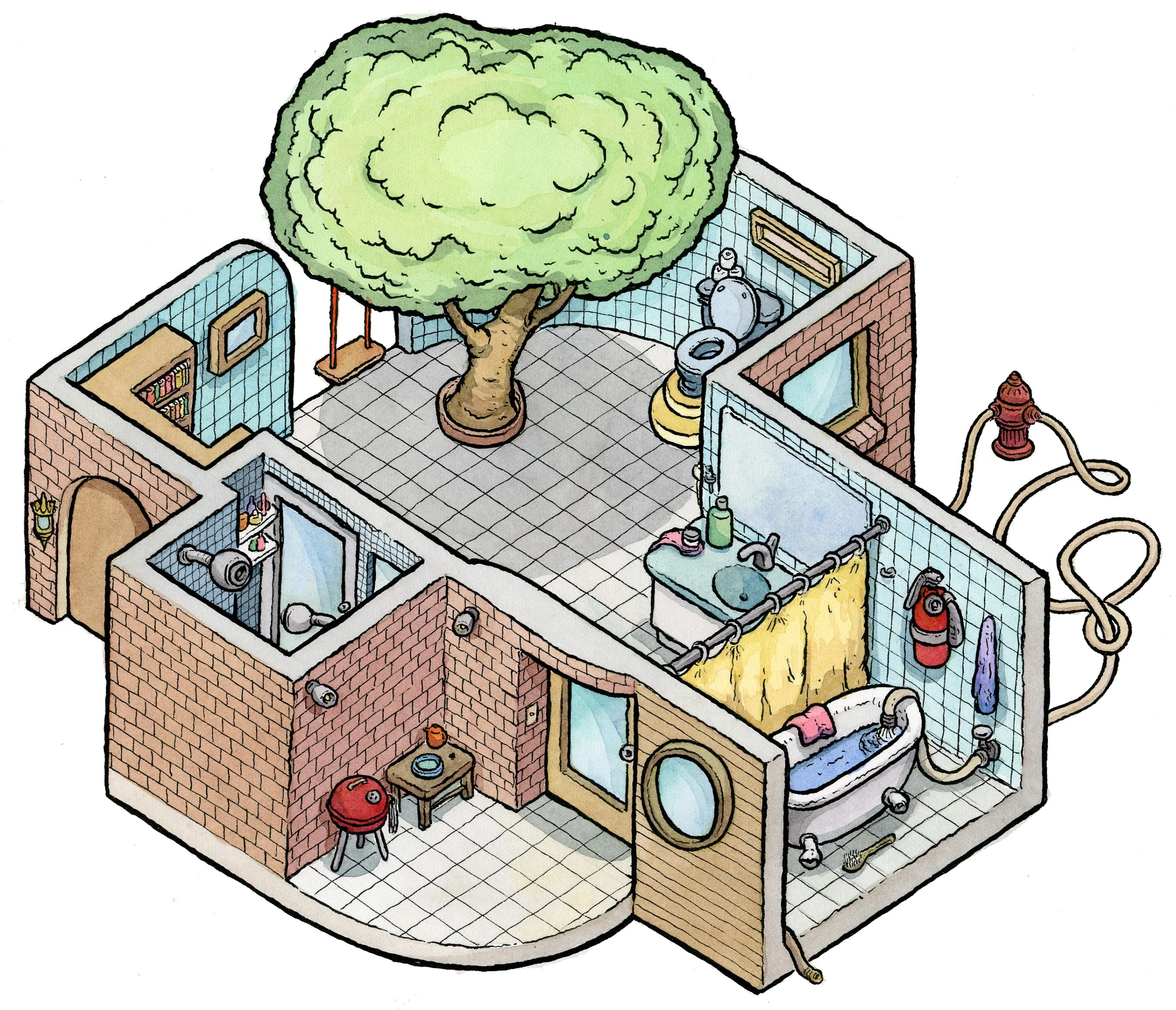 Bathroom Final Nov 26 Written By scott teplin 8" x 10" Kickstarter reward - custom bathroom drawing WATERCOLORpen & inkROOMSpromotional scott teplin http://www.teplin.com