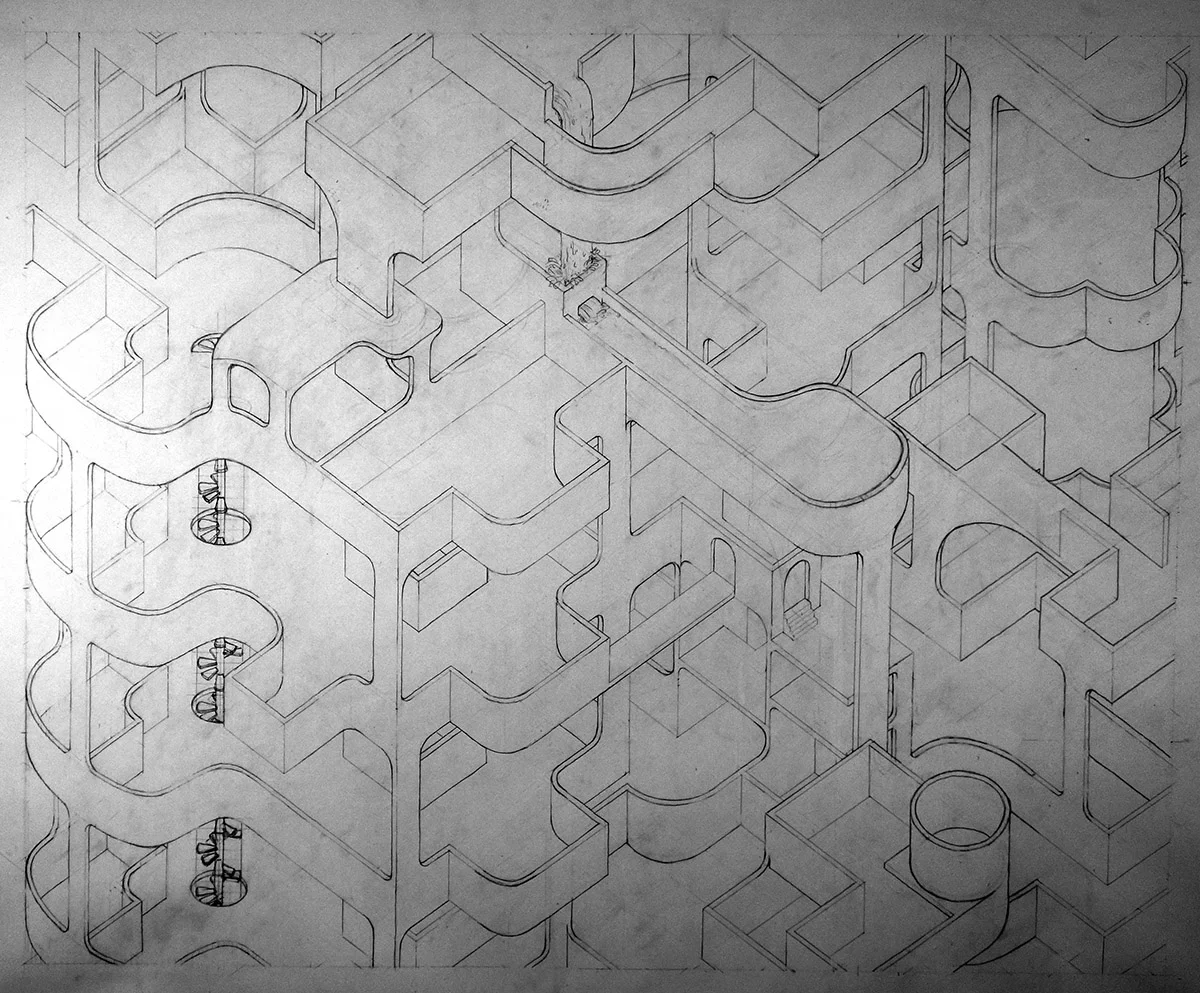 Big Hospital - pencil outline Progress Jan 9 Written By scott teplin 52" x 62" graphiteROOMS scott teplin http://www.teplin.com